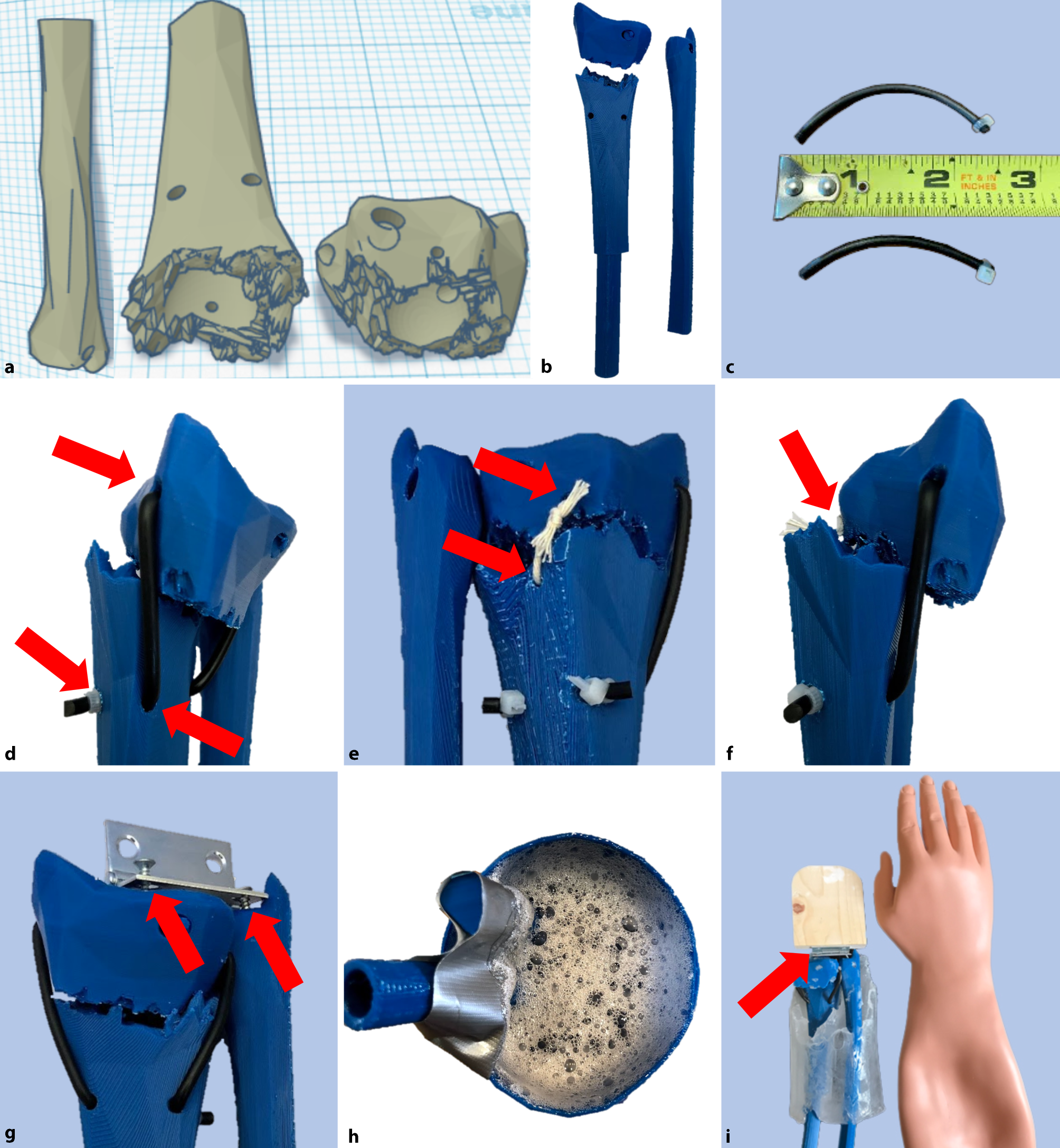 Steps in assembly of distal radius fracture model. a Computer Assisted Design (CAD) drawings of ulna and fractured radius. b Individual 3D printed models of ulna and fractured radius. c O-rings are cut into appropriate sizes and zip-ties placed at one end of each. d O-rings are placed through pre-printed holes in the distal fragment of radius. Second end of O‑rings is placed through pre-printed holes in the proximal radius fragment with zip-ties secured on exposed ends. e String is threaded through pre-printed holes on volar aspects of both fracture fragments and tied together. f String length is adjusted as needed until optimal displacement is achieved. g 1.5-inch (3.81 cm) hinges are screwed into pre-printed holes on both radius and ulna. h 3D printed bones are cast in simulation gel; the dorsal aspect of the model is taped to the side of the mold to remain close to the surface. After cooling, the thin layer of gel on the dorsal side is removed. i The free side of the hinge is screwed to the wooden block that serves as the hand (oriented so the wrist can be displaced dorsally) and the model is inserted into the simulation arm. Talcum powder facilitates placement into the skin