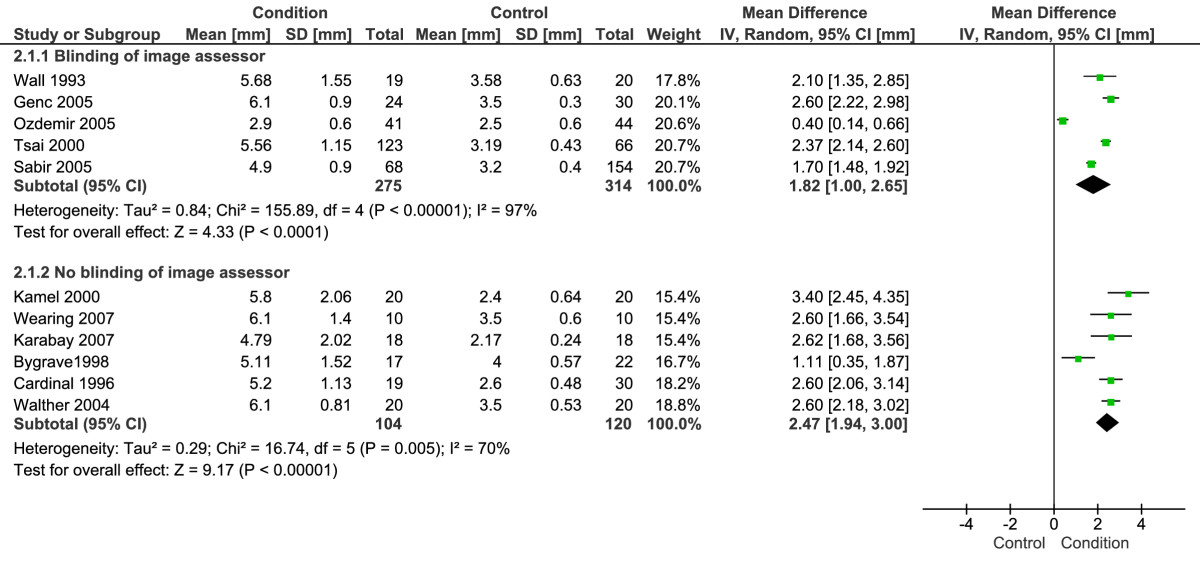 Forest plot of studies reporting the thickness of the proximal plantar fascia by ultrasonography. Sub-group analysis: blinding versus no blinding of image assessor.