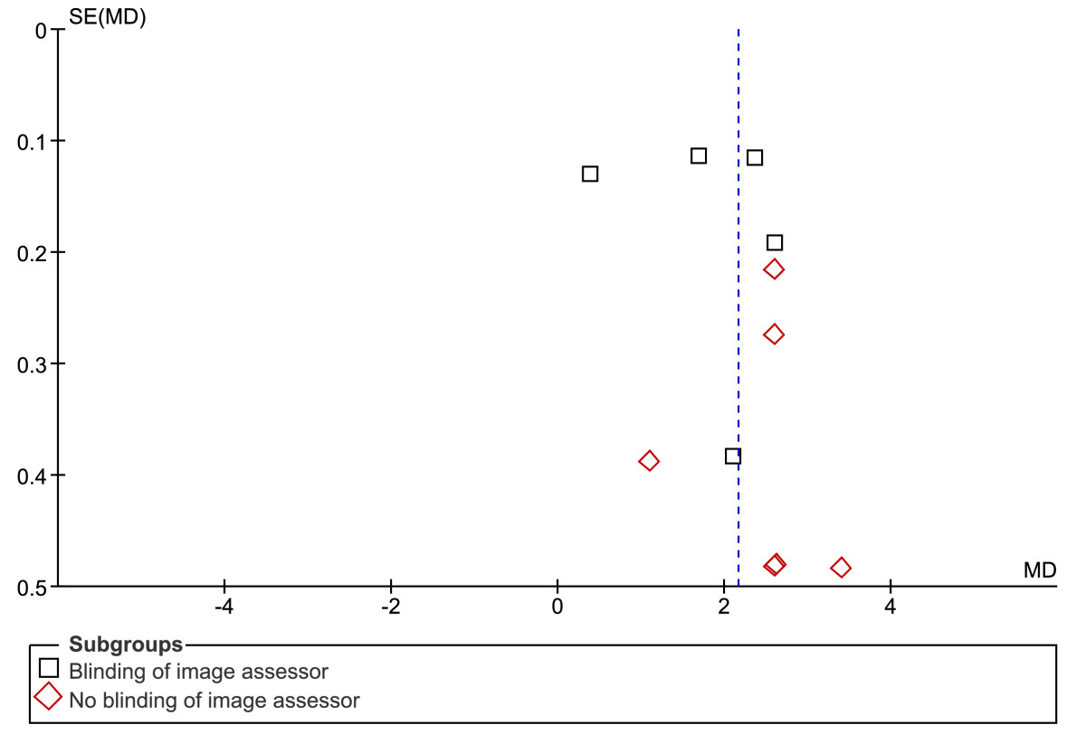 Continuous data were analysed by obtaining the mean values, standard deviations (SD) and sample size for each study within the group. The difference in means and 95% confidence interval (CI) for each individual study were calculated, and the weighted pooled estimate determined by the inverse-variance method. For dichotomous data, the odds ratio (OR) and 95% CI for each individual study were calculated, and the weighted pooled estimate determined by the inverse variance method. Sensitivity analysis was performed to exclude studies that did not apply a blinding technique to the image assessor. Sub-group analysis was performed for groups containing ten studies or more [16] to compare the pooled estimates of blinded and non-blinded studies. However, formal sub-group comparisons were not performed for heterogeneous data (I2 > 50%, P < 0.1) to reduce the risk of false positive results [16].