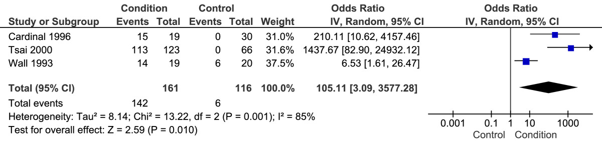 Two studies included in the analysis above [13, 29] also reported the proportion of participants in each group with plantar fascia thickness values > 4.0 mm (i.e. the thickness values for participants were dichotomised). Additionally, one study included in the analysis above [25] reported the individual thickness values for each participant, allowing dichotomisation for the purpose of this review. These studies included a total 161 CPHP participants and 116 control participants. Statistical heterogeneity between studies was very high (I2 = 85%; Chi2 = 13.22, df = 2, P = 0.001), therefore meta-analysis was undertaken using the random-effect method. The mean difference between groups was statistically significant (P = 0.01) with CPHP participants over 100 times more likely than control participants to have plantar fascia thickness values > 4.0 mm (OR = 105.11, 95% CI = 3.09 to 3577.28) (Figure 4).