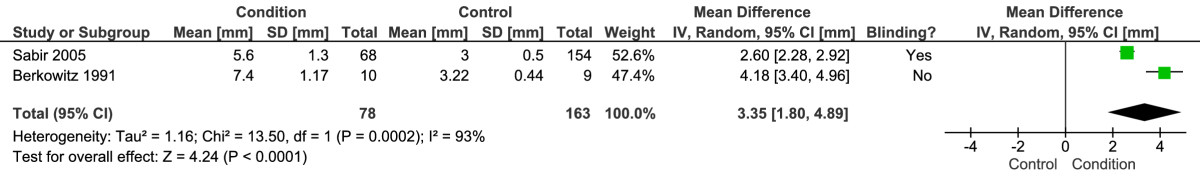 Two studies with a total 78 CPHP participants and 163 control participants were included in this analysis. Statistical heterogeneity between studies was very high (I2 = 93%; Chi2 = 13.50, df = 1, P < 0.001), therefore meta-analysis was undertaken using the random-effect method. The mean difference between groups was statistically significant (P < 0.001), with the proximal plantar fascia of CPHP participants 3.35 mm thicker than control participants (95% CI = 1.80 to 4.89 mm) (Figure 5). The blinded study reported a more conservative difference between groups (2.60 mm, 95% CI = 2.28 to 2.92 mm) than the non-blinded study (4.18 mm, 95% CI = 3.40 to 4.96 mm).