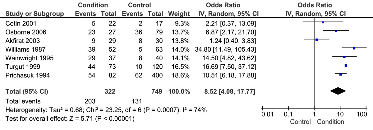 Seven studies with a total 322 CPHP participants and 749 control participants were included in this analysis. Statistical heterogeneity between studies was high (I2 = 74%; Chi2 = 23.25, df = 6, P < 0.001), therefore meta-analysis was undertaken using the random-effect method. The mean difference between groups was statistically significant (P < 0.001) with CPHP participants over 8 times more likely to show evidence of subcalcaneal spur than control participants (OR = 8.52, 95% CI = 4.08 to 17.77) (Figure 7). Sensitivity analysis revealed an increased pooled estimate after exclusion of the four [26, 38‐40] non-blinded studies (OR = 16.11, 95% CI = 7.09 to 36.60, P < 0.001).