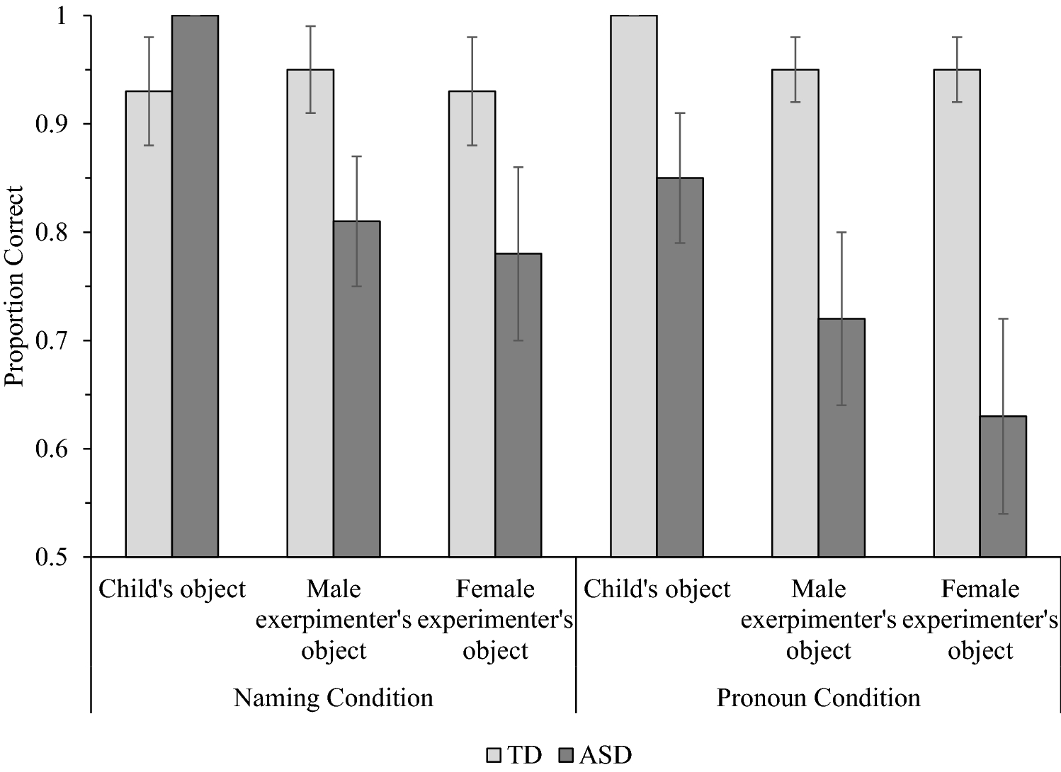 Mean accuracy for typically developing (TD) children and children with autism spectrum disorder (ASD) in the Naming and Pronoun conditions of the owner identification task. Error bars show ± 1 SE. All bars significantly exceeded chance (0.33) at p < .01