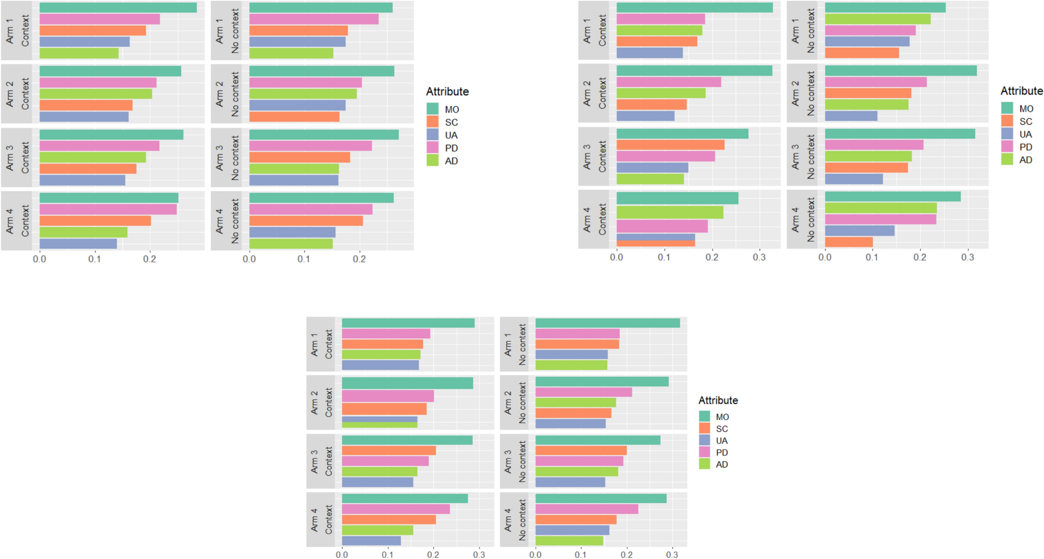 The Australian data (Appendix 2, Table 3a) shows similar variability but with generally larger magnitude coefficients. For instance, in study arm 1, mobility level 5 shows stronger context effects (MO5: -0.606 vs -0.467) compared to the Irish data. The UK data (Appendix 2, Table 3c) also demonstrates mixed patterns. For example, in study arm 1, mobility level 5 shows similar context effects to Australia (MO5: -0.607 vs -0.532), but other dimensions show more modest differences between context and no-context scenarios.