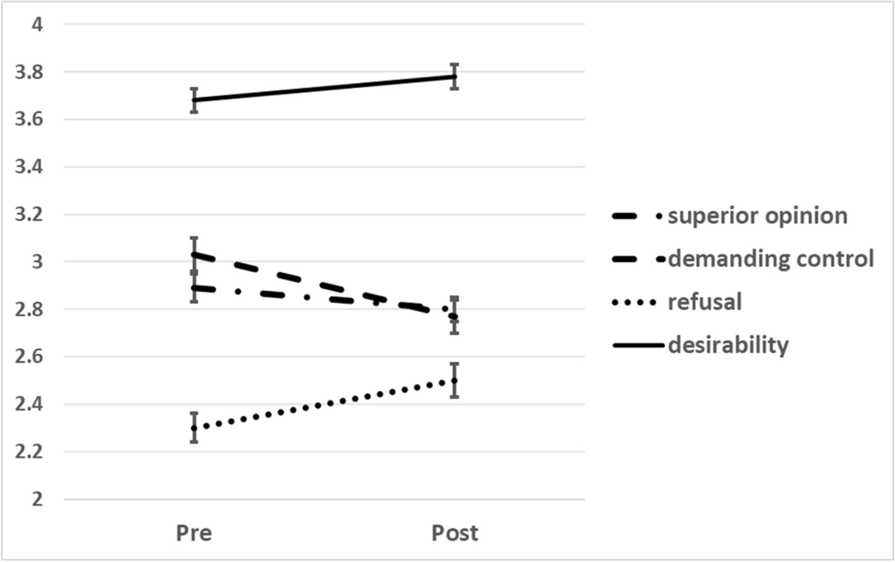 However, two aspects of EF increased, slightly but significantly, over the course of the MBSR intervention: refusal and desirability. In the case of refusal, the relatively low baseline levels may point towards an explanation. Analogous to the often seen relatively low self-esteem at pre-intervention in psychological intervention groups, a low level of assertiveness may be expected. During the MBSR courses, participants learn to take better care of themselves, including standing up for themselves when needed (Kabat-Zinn, 1990). This effect may be reflected in post-intervention higher scores on items such as “If I don’t feel like it, I won’t do it”, probably reflecting not just an aspect of EF, but also assertiveness and taking care of oneself. Thus, this effect may be seen as adaptive in this context. Below we will attempt to enhance the conceptual and functional clarity among these various concepts.