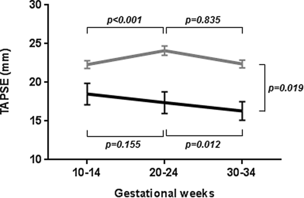 Patterns of tricuspid annular plane systolic excursion (TAPSE) during pregnancy in women with elevated first-trimester N-terminal pro-B-type natriuretic peptide (NT-proBNP) levels (black line, n = 12) and women with normal first-trimester NT-proBNP levels (grey line, n = 92). A significant difference in the pattern of TAPSE was found between women with elevated NT-proBNP and those with normal NT-proBNP (p = 0.019). TAPSE increased from 10–14 weeks to 20–24 weeks in women with normal NT-proBNP. Only in women with elevated NT-proBNP did TAPSE significantly decrease from 20–24 weeks’ to 30–34 weeks’ gestation