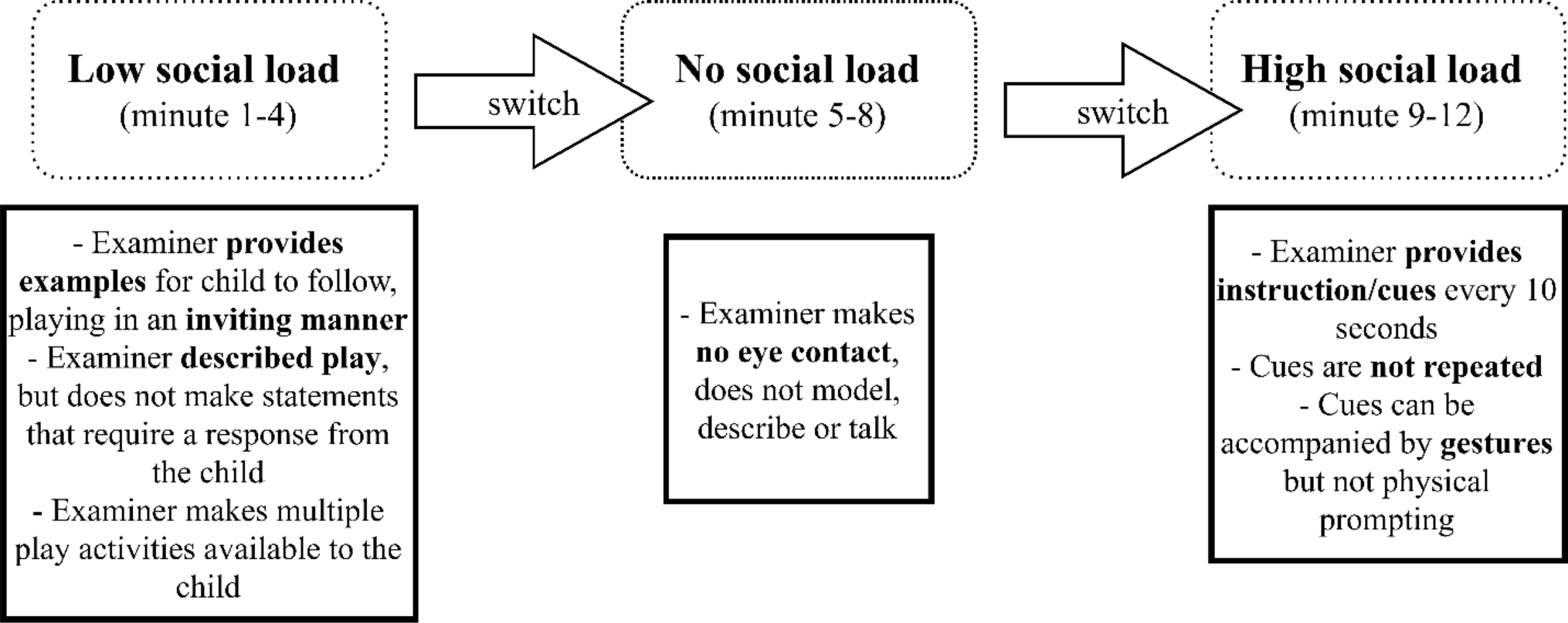 The Interaction subtest of the Autism Screening Instrument for Educational Planning—Third Edition (ASIEP-3; Krug et al., 2008) was administered, in order to measure social interaction behaviors including spontaneous social responses, acknowledgement of direct requests, and the ability of the child to socially interact with an examiner under different conditions of external social load. The ASIEP-Interaction subtest is a time structured and standardized play setting, and consists of three different environmental conditions of four minutes each that were always administrated in the same order: (1) the active modeling condition: basic inviting parallel play modelled by the examiner, defined as the low social load condition, (2) the passive/no interaction condition: the withdrawal of engagement and attention by the examiner, defined as the no social load condition, and (3) the direct cues condition: the examiner gives specific cues and directions to the child, defined as the high social load condition. The examiner used age appropriate toys and activities during the play situation, as well as language appropriate for the skill level of the child. See Cordeiro et al., (2012) for additional descriptions of the interaction assessment, and Fig. 1 for an overview of the three conditions and task administration descriptions.