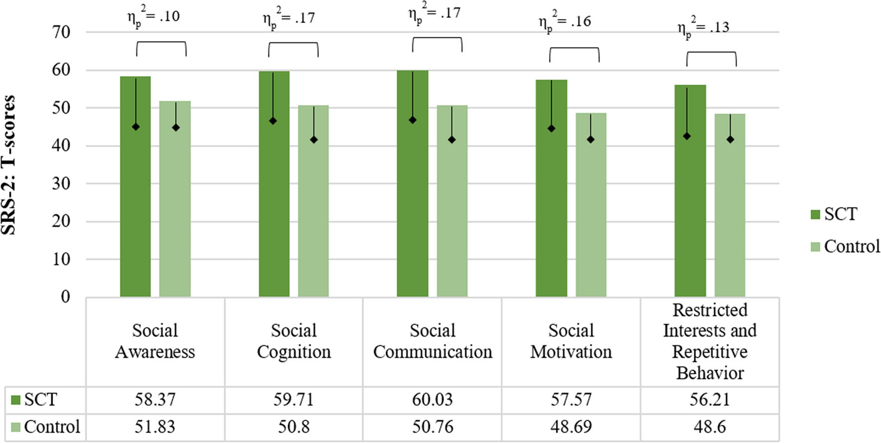 Social impairments associated with Autism Spectrum Disorder (ASD) in the SCT and control group (Mean). ηp2 = effect size; = Standard Deviation (only lower bar depicted)