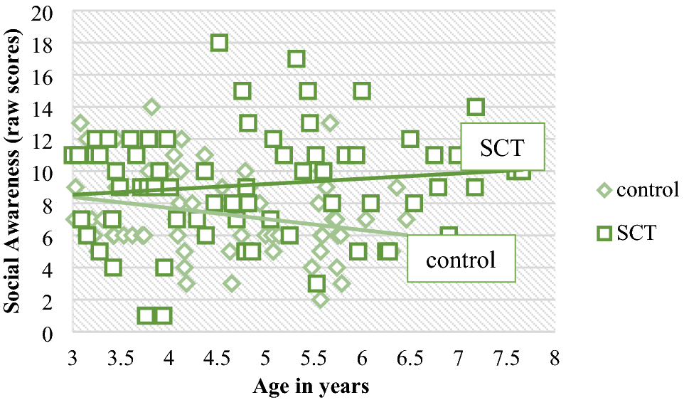 In order to investigate the moderating effect of age on differences between the SCT and control group PROCESS analyses were carried out. Because aggressive behavior was almost non-existent in both the SCT and the control group during the ASIEP, and the distribution of aggression was insufficient, aggressive behavior was not included in the analyses. No moderating effects of age were found on social interaction behavior. See Table 2 for exact B, t- and p-values of the PROCESS models. Regarding social impairments, a moderating effect of age was found for social awareness (p = 0.028), indicating that the difference between children with SCT and control children was larger in older ages (see Fig. 4).