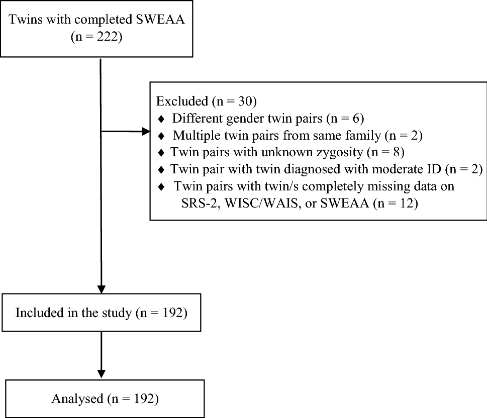 In the total RATSS sample, a total of 222 participants had completed the SWEAA. Twin pairs that were of different gender were excluded (n = 6). From one family two twin-pairs had participated and one pair was thus excluded (n = 2). Furthermore, we excluded twin pairs where one twin had not completed the SWEAA (n = 2), or where one or both twins had completely missing data on SRS-2 (n = 6) or the Wechsler Intelligence Scales (n = 4). Finally, twins where zygosity had not yet been determined (n = 8), or where one twin had a moderate ID (n = 2) were excluded, resulting in the final sample of 192 participants. Figure 1 shows excluded twin pairs and the final sample included in the analyses.