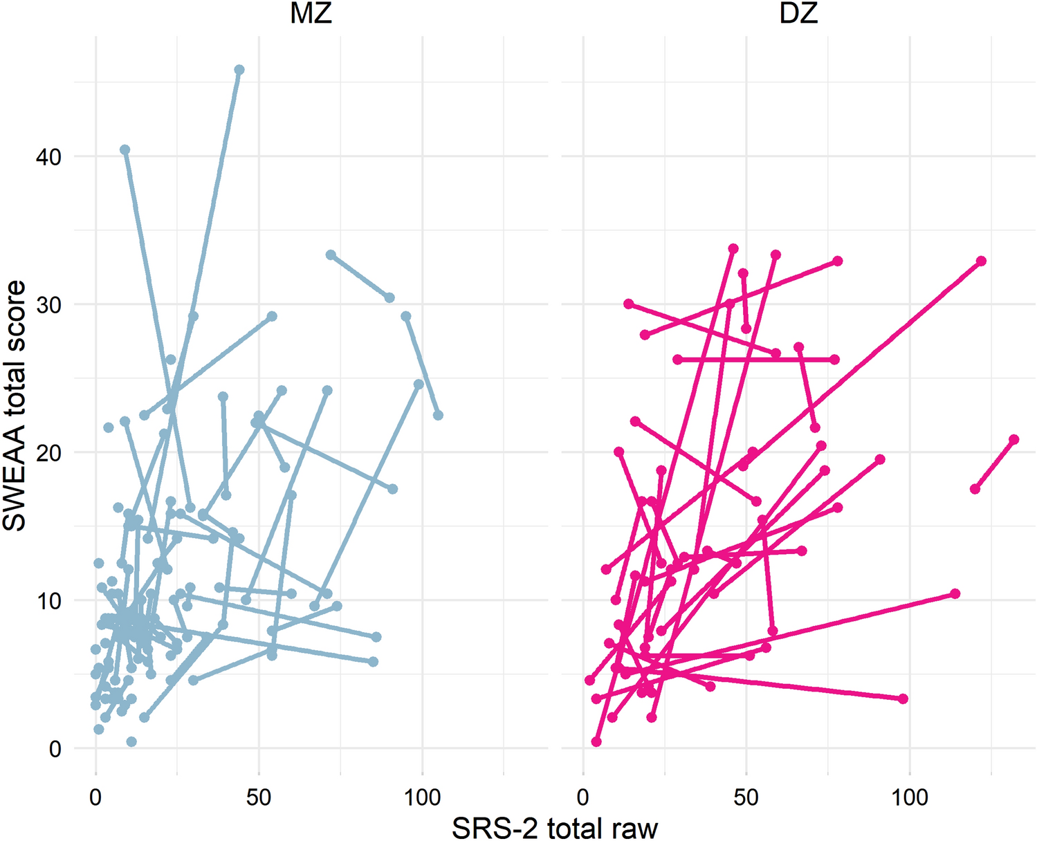 Within-pair associations between autistic traits and total eating problems in MZ- and DZ-pairs. The twins in each pair are shown connected with a line