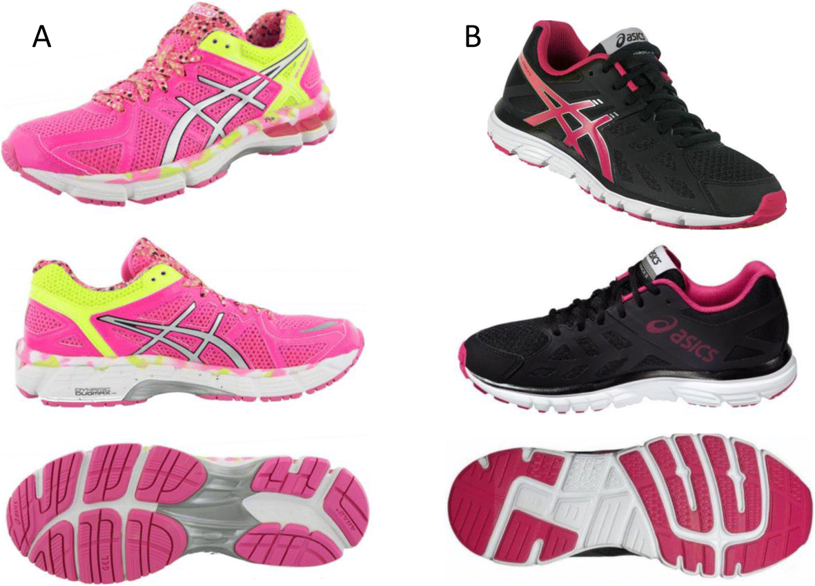 The high-support shoes (ASICS Kayano-GS, a) featured a medial post, < 10° torsional stiffness, < 10° heel counter stiffness and < 45° midfoot longitudinal stability. In contrast, the low-supportive shoes (ASICS Zaraca 3, b) featured a uniform midsole density, 10–45 ° torsional stiffness, 10–45° heel counter stiffness and > 45° midfoot longitudinal stability