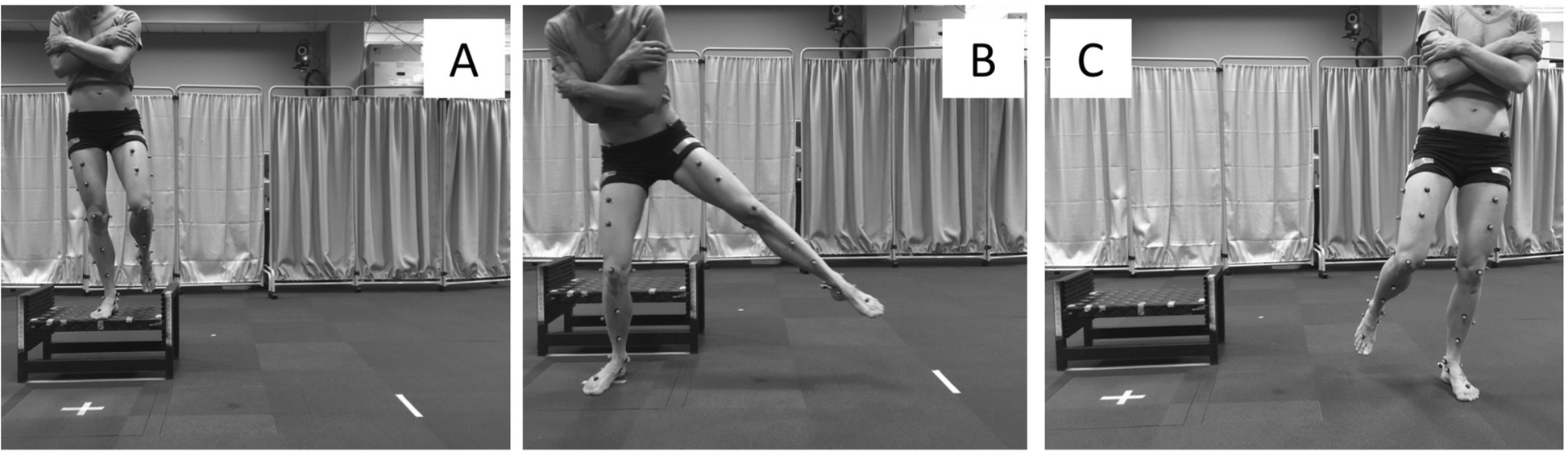 The single-limb drop lateral jump task involved the participant balancing on their non-dominant test limb with hands folded across chest (a), hop down towards the “X” marked on the ground (b) and then laterally hop/cut 90° as quickly as possible towards their dominant limb, landing and balancing for 5 s (c)