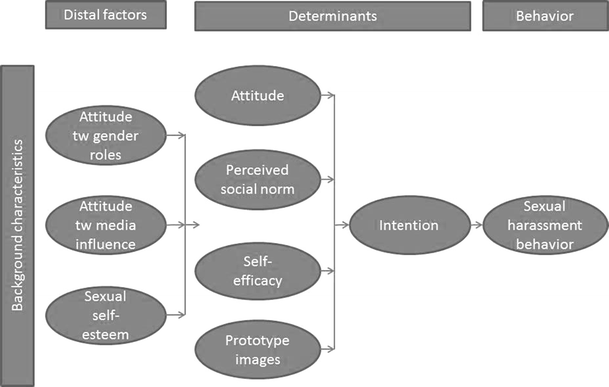 The behavioral determinants subjective norm and self-efficacy are significant predictors of behavioral intention with regard to rejecting sexual harassment for boys and girls alike (Yu Li et al. 2010). These determinants from the Theory of Planned Behavior (Ajzen 1991) and Reasoned Action Approach (Fishbein and Ajzen 2010) assume decision making to be a reasoned and deliberative process (Albarracín et al. 2001). The Prototype Willingness Model, however, can help to explain non-intentional, but volitional adolescent risk behavior (Gerrard et al. 2008). One of the assumptions of the Prototype Willingness Model is that children and adolescents have clear cognitive representations or social images (prototypes) of the type of person their age who engages in specific risk behaviors (Gibbons et al. 2004; Connor and Norman 2005). If we extrapolate from Webb and Sheeran’s (2006) suggestion that attention should be paid to non-intentional routes to adolescents’ action, it may thus be relevant to study adolescents’ images of prototypes of victims and perpetrators of sexual harassment. Effects of perceptions of prototype behavior have been found earlier in studies on adolescent alcohol use (Todd and Mullan 2011) and smoking behavior (Hukkelberg and Dykstra 2009). Several studies also showed that sexual harassment behavior is also influenced by attitudes towards gender roles, attitudes towards media influence, and the adolescents’ self-esteem (De Bruijn et al. 2006).