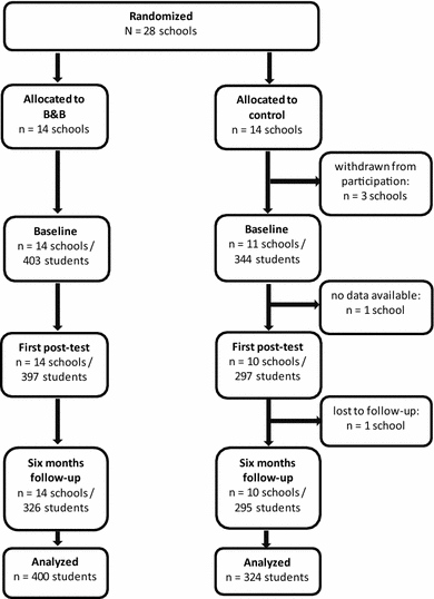 We followed a cluster-randomized controlled design in which schools were paired according to educational level and the degree of urbanization of the school area. The schools were then randomly assigned to the experimental or control condition. The target group consisted of male and female urban adolescents aged 12–16 years from various ethnic backgrounds.