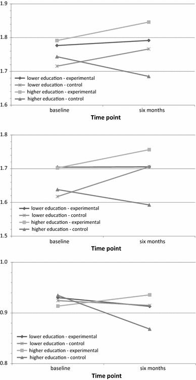 At 6-month follow-up, significant interaction effects were found between study group and educational level (see Fig. 3) on the following three determinants: attitude towards committing sexual harassment (\( \bar{\Delta}_{\exp } \) = .55, \( \bar{\Delta}_{\text{con}} \) = −.58; p < .05); social norm with regard to committing sexual harassment behavior (\( \bar{\Delta}_{\exp } \) = .54, \( \bar{\Delta}_{\text{con}} \) = −.46; p < .05); and prototype of a perpetrator of sexual harassment (\( \bar{\Delta}_{\exp } \) = .11, \( \bar{\Delta}_{\text{con}} \) = −.33; p < .05). Students with a higher educational level in the experimental group reported a more negative attitude towards committing sexual harassment and also reported a more negative social norm with regard to committing sexual harassment behavior than students with a higher educational level in the control group. In addition, students with a higher educational level in the experimental group reported a more negative image of the prototype of a perpetrator of sexual harassment than students with a higher educational level in the control group. No further interaction effects were found on the remaining determinants and distal factors influencing the behavior.