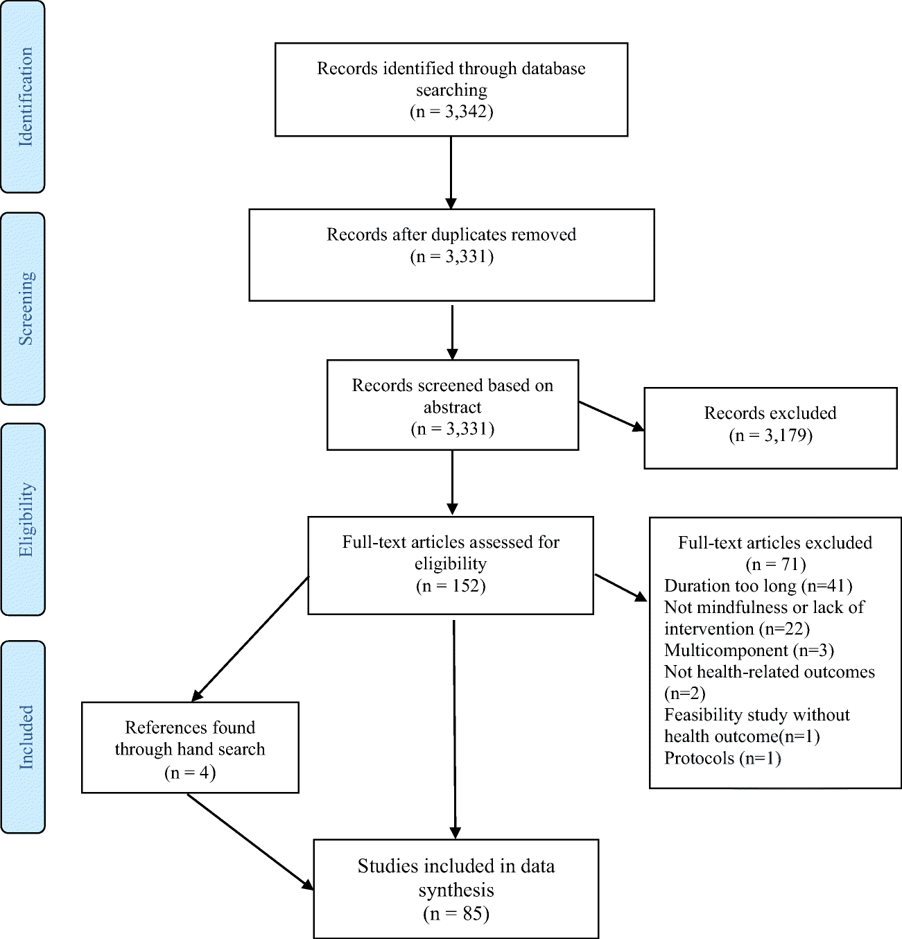 The selection of studies is illustrated in Fig. 1, using the PRISMA flow diagram (Moher et al. 2009). The search identified 3342 papers, which were screened for eligibility. After removal of duplicates and those deemed ineligible, 152 full-text articles were retrieved and read in full by two reviewers (AH and MU). Hand searches identified a further four papers which were read in full. A total of 85 studies were included in the review.