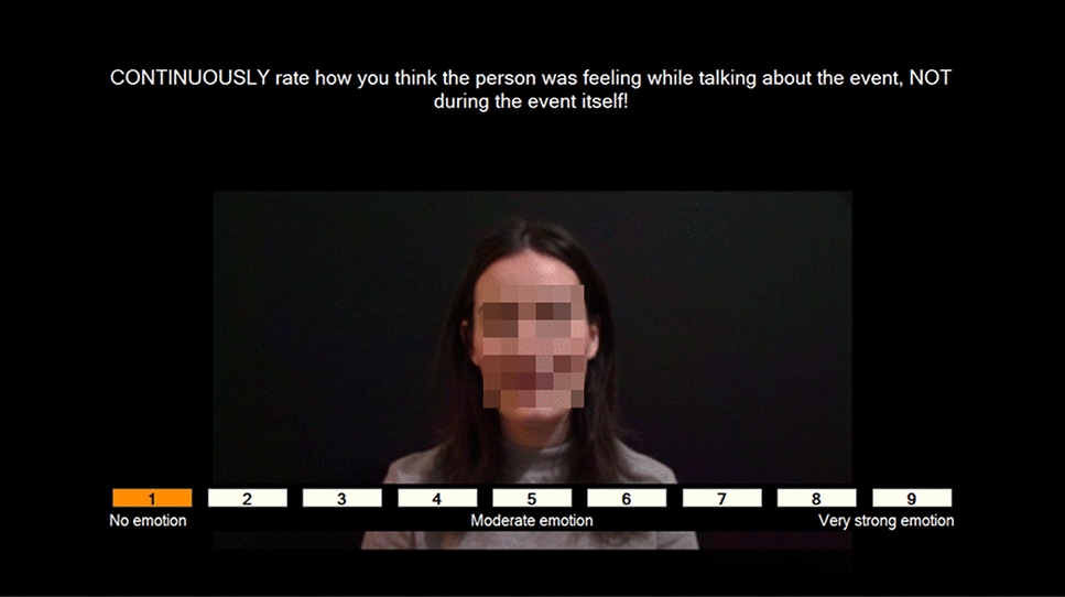 The ten clips were arranged into two playlists (A and B), each presenting the clips in different orders. To reduce order effects, the playlists were counterbalanced across participants (and groups). Whilst watching the clips, participants used the arrow keys on the keyboard to continuously rate the intensity of the narrator’s emotions on a scale from 1 (no emotion) to 9 (very strong emotion) (Fig. 1). The correlation between the narrators’ ratings of their own clips (how they felt while talking about the event) and the participant’s ratings of the narrator’s feelings yielded the measure of EA.