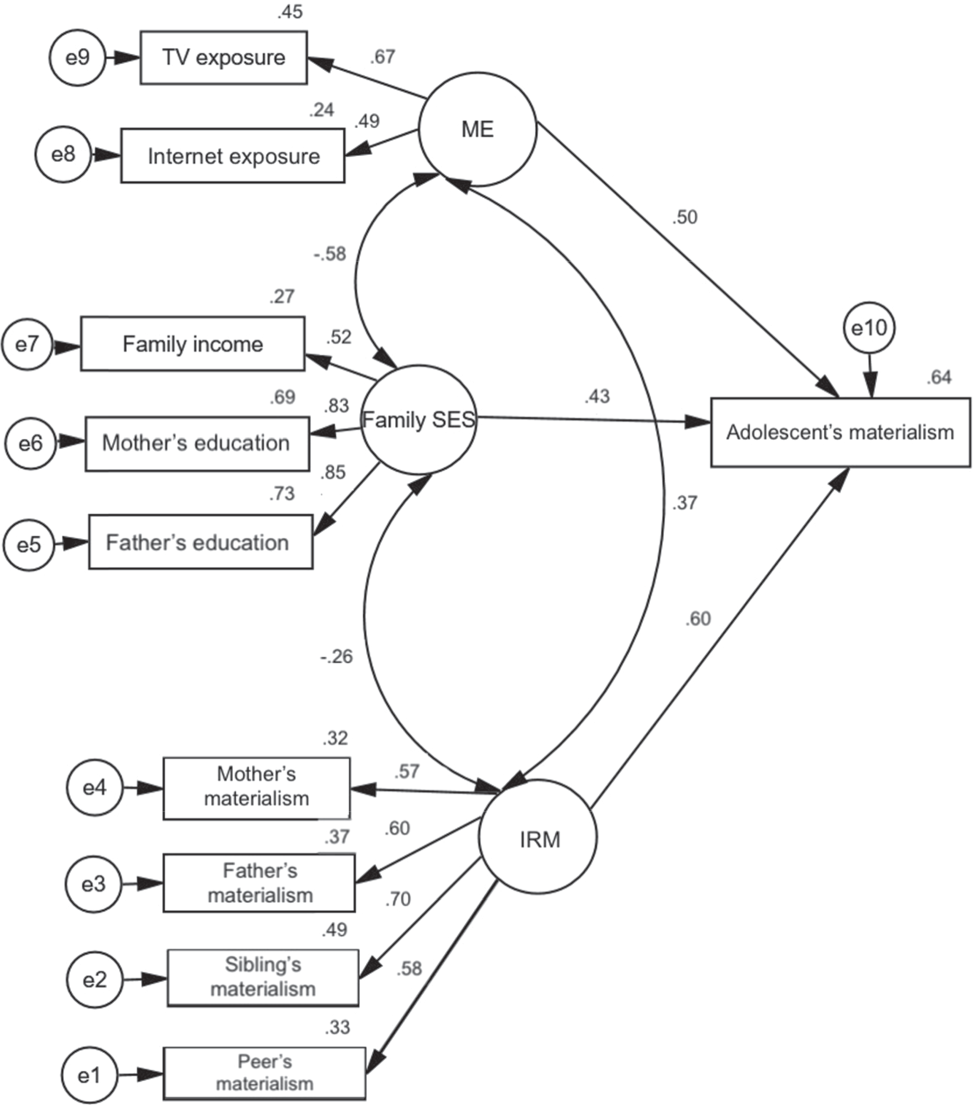 Table 1 displays correlations among all studied variables. The target adolescents’ materialism was significantly positively statistically correlated with all four interpersonal role models’ (i.e., the mother’s, father’s, sibling’s, and peer’s) materialism as well as media exposure (TV and the Internet); it was unrelated to family SES (i.e., family income, mother’s education, father’s education), the adolescent’s sex, and the adolescent’s age.