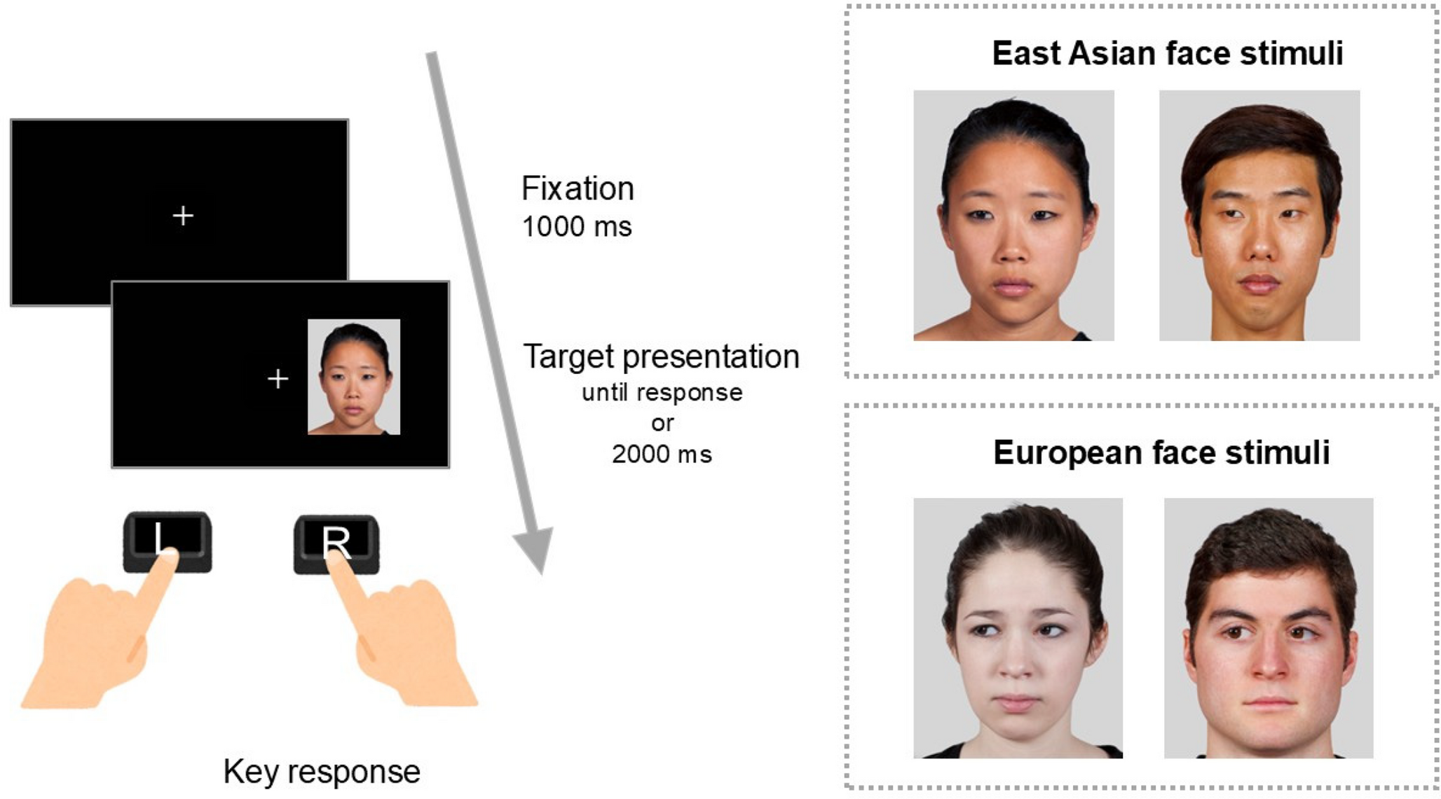 At the beginning of each trial, a fixation cross was presented for 1000 ms at the centre of the screen. Then, a target stimulus (i.e., an arrow, an East Asian face, or a European face) was presented until response (timeout: 2000 ms), either to the left or right of the fixation point. Participants were instructed to press the “F” key if the target pointed left and the “J” key if it pointed right. They were asked to respond as quickly and accurately as possible. The word “incorrect!!” was presented for 700 ms when the incorrect key was pressed. The direction and location of the target were randomised within each experimental block. Arrow and face targets were presented in separate blocks; however, East Asian and European faces were intermixed within the same block. At the end of the experiment, participants rated the familiarity of each face on a five-point Likert scale ranging from 1 (Not at all familiar) to 5 (Extremely familiar). They were also asked to classify the ethnicity of each face as East Asian, European, or other.