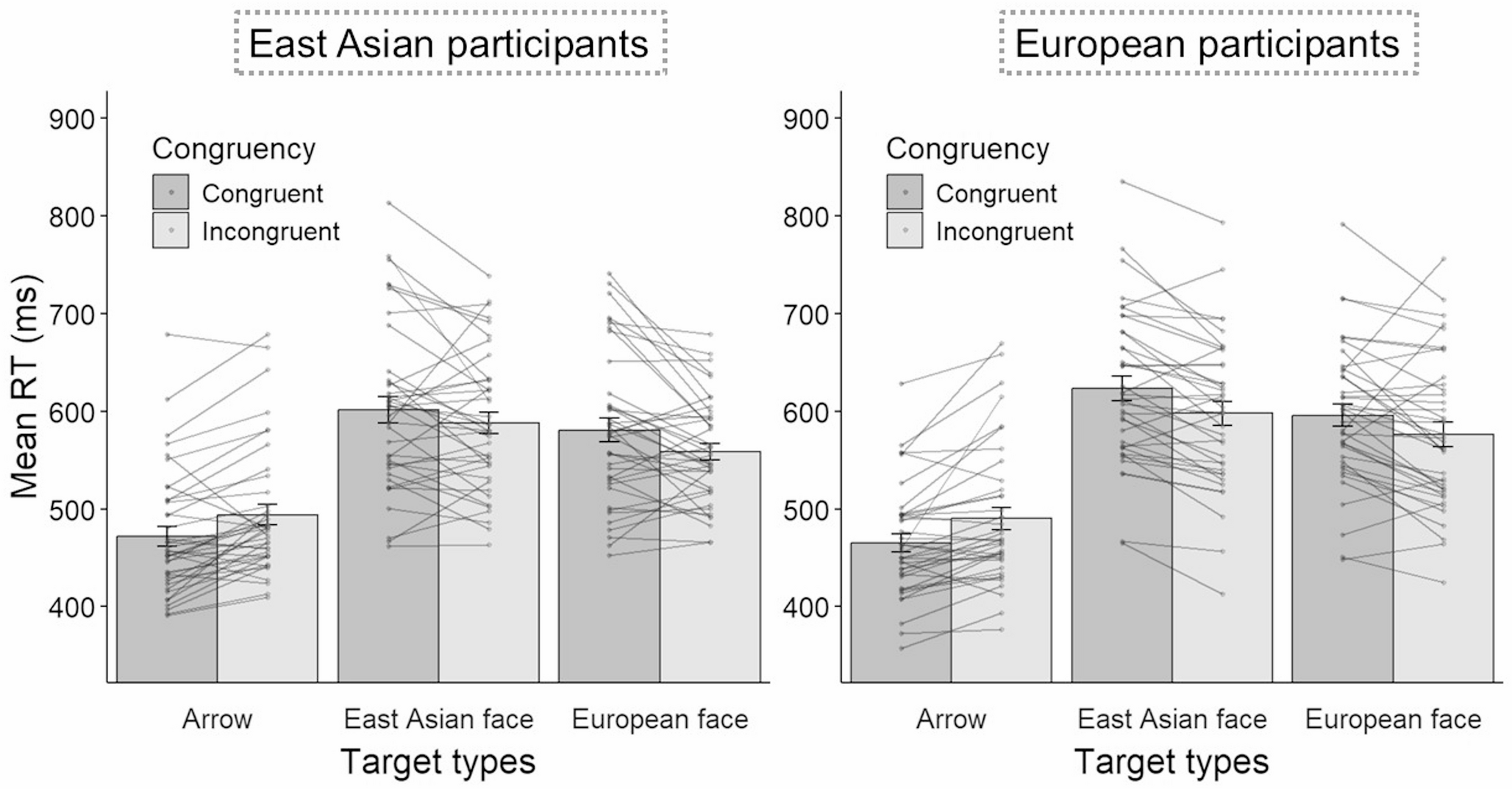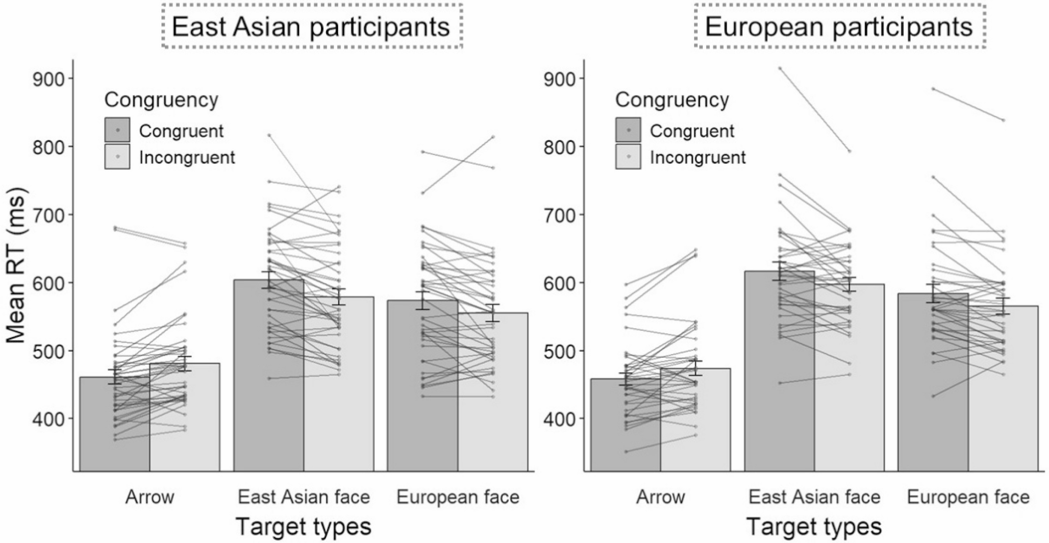 Mean RTs were subjected to a three-factor ANOVA with target type (arrow, East Asian, and European) and congruency (congruent and incongruent) as within-participant variables and participants’ ethnicity (East Asian and European) as between-subject variables. There was a significant main effect of target type, F (2, 152) = 255.15, p <.001, η2p = 0.77, indicating that mean RTs were faster for arrow targets than for East Asian and European face targets (adj. ps < 0.001). Mean RTs were faster for European face targets than for East Asian face targets (adj. p <.01). The main effect of congruency was also significant, F (1, 76) = 8.36, p =.005, η2p = 0.10.