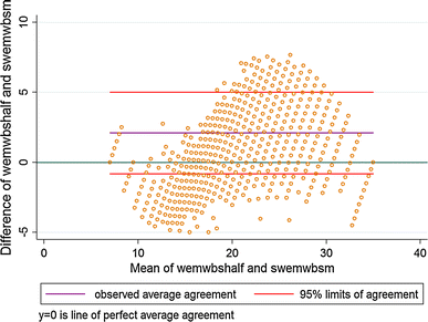 To assess the extent of agreement between the two scales, we used the Bland–Altman method to plot the difference in scores for each respondent (WEMWBS–SWEMWBS) against the mean of the two scores. WEMWBS score was first divided by two to make the scale comparable to SWEMWBS, which ranges from 7 to 35. The Bland–Altman plot enables a visual inspection of the association between the differences in scores and the magnitude of wellbeing. Spearman correlation coefficients were calculated between SWEMWBS and WEMWBS, both overall and within subgroups, to explore similarities in the consistency of rankings. Since SWEMWBS was embedded in WEMWBS, potentially leading to upward bias in the estimates of correlation, we also present Spearman correlation coefficients between SWEMWBS and the seven items from the 14-item WEMWBS that were not included in the shorter scale. To explore the classification accuracy of SWEMWBS relative to WEMWBS, weighted kappa statistics were calculated between the three-category version of SWEMWBS and WEMWBS, and repeated within population subgroups. To assess the strength of agreement, we used the Landis and Koch classification [26]: slight: 0–0.20; fair: 0.21–0.40; moderate: 0.41–0.60; substantial: 0.61–0.80; and almost perfect: 0.81–1.00. Percentage agreement in the classification was also assessed.
