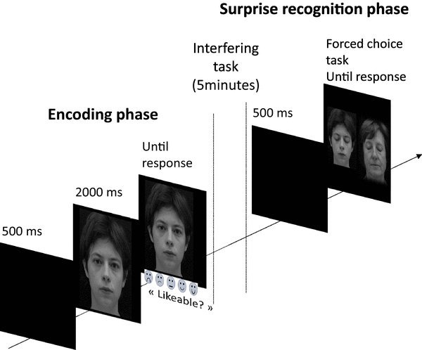 Illustration of the experimental design. During the encoding phase, participants were presented one by one with 20 faces displaying either direct or averted gaze and were asked to rate each face’s degree of likeability on a Likert scale ranged from 1 (“Not at all likeable”) to 5 (“Very likeable”). After a 5-min interfering task, they were shown 20 pairs of faces with closed eyes and were asked, at each trial, to report which of the two faces they have seen before (surprise memory phase)