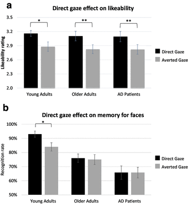 Finally, we showed that AD patients encode faces as a function of their likeability. This result suggests that despite the lack of direct gaze effect on face recognition in our study, memory performances for faces could still be improved in AD patients by taking advantage of the positive impact of direct gaze on social judgement. Interestingly, this finding can be easily translated in clinical practice by encouraging professional caregivers to maximize eye contact behaviours with AD patients to increase the chances to easily establish a fulfilling patient–carer relationship.