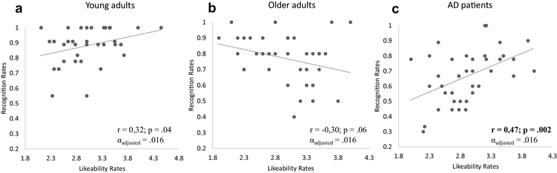 Correlation between mean ratings of likeability and mean recognition rate for each stimulus in a young adults, b healthy older adults and c AD patients