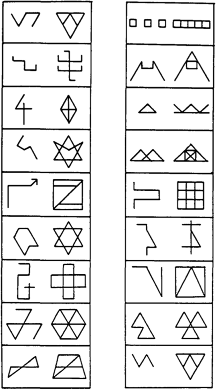 Gottschaldt (1926, 1929) introduced the Embedded Figure Test as a suitable measure of the ability to disentangle a figure from the background. The test material is a series of meaningless geometrical patterns in which a simpler geometrical figure is embedded, and the task requirement is to pencil it in. Following the original Gottschaldt’s Hidden Figure Test (GHFT), different versions of the Embedded Figures test have been devised, in which individuals are required to identify a target (simple) shape within complex designs. The most known version is that developed by Witkin et al. (1971).