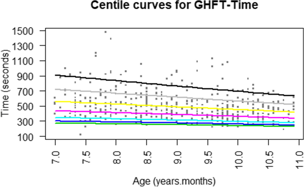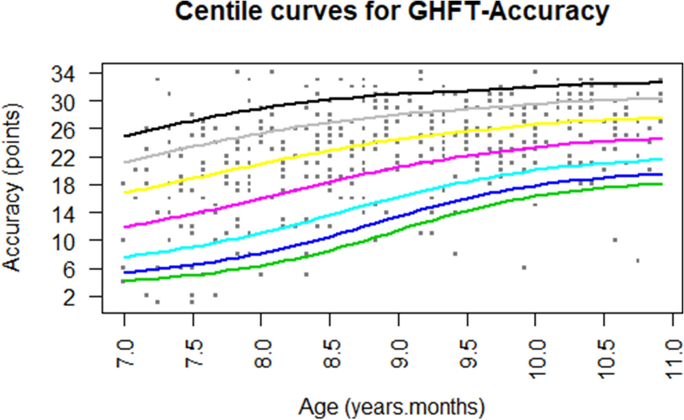 Centiles for time and accuracy scores of the GHFT were computed using the LMS method (Cole & Green, 1992), which allows for obtaining normalized growth centile standards. The method assumes that data can be normalized using a power function, which stretches one tail of the distribution while shrinking the other. The optimal power (i.e., Box–Cox power transformation) to obtain normality was calculated for each age group and the trend summarized by a smooth (L) curve. Trends in the mean (M) and coefficient of variation (S) were similarly smoothed.