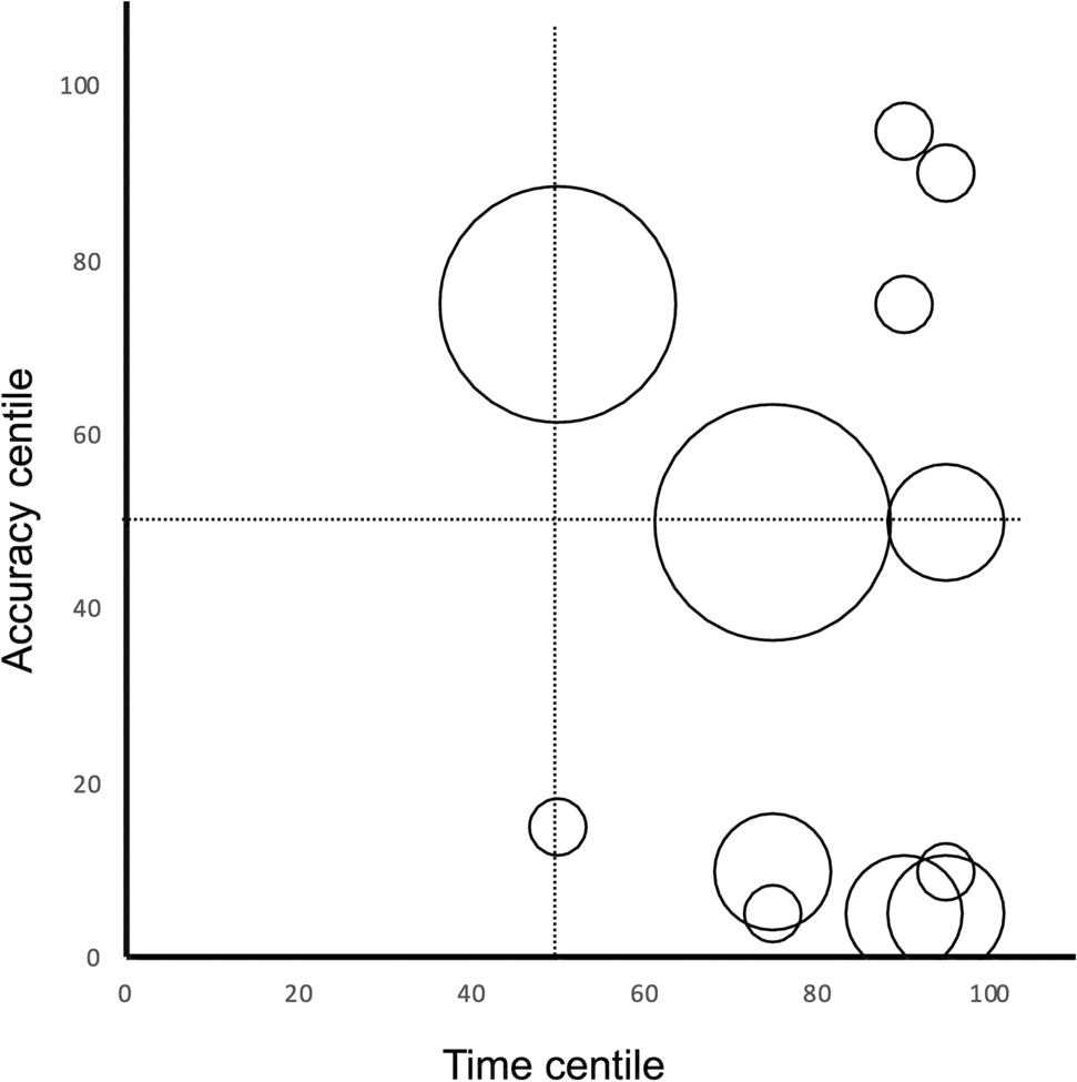 Percentiles of age-corrected GHFT accuracy and time scores achieved by single individuals with autism in reference to normative data obtained from Study 1. Dimension of symbol is proportional to density of observations (the smallest symbols represent one individual, the largest four individuals). The dotted lines represent the 50th percentile