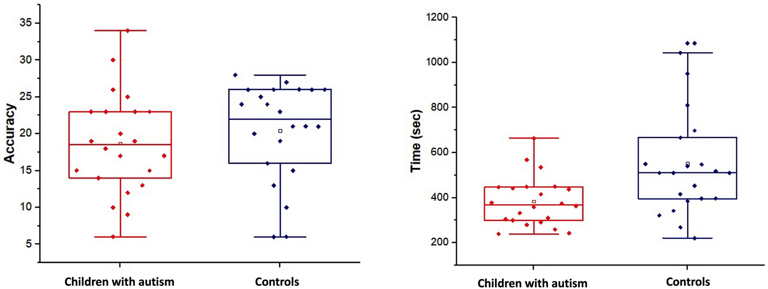 Time and accuracy scores of the GHFT, separately for children with autism and typically developing participants. Boxes represent 25 and 75 percentiles. The solid line inside the box represents the median of the group, while the empty square in the box represents the mean. Bars above and below the boxes represent the interquartile range. Each individual dot represents a subject