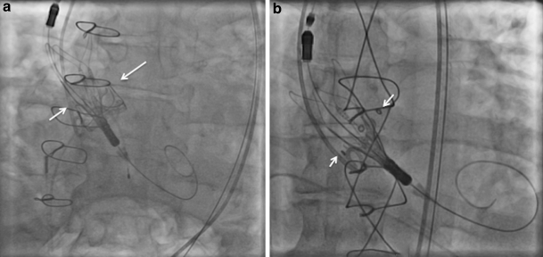 a Positioning of an Accurate Neo device inside a Carpentier-Edwards Perimount aortic bioprosthesis with its upper crowns sitting just below the superior margin of the bioprosthesis (arrows). b Positioning of an Accurate Neo device inside a Mosaic aortic bioprosthesis with its upper crowns positioned along with the eyelets of the bioprosthesis (arrows)