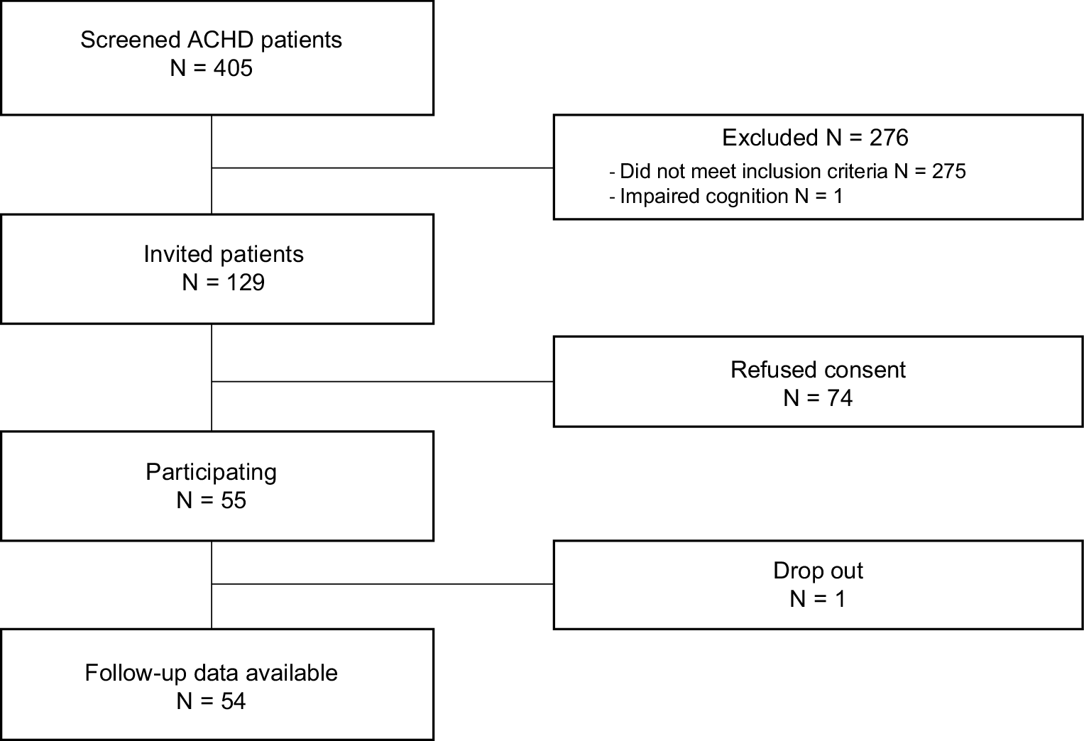 Patient enrolment started in June 2017 (Fig. 1). Up to March 2018, 129 symptomatic adult CHD patients were eligible, of whom 55 (43%) consented to participate (median age of 45 years (range 19–70), 34.5% male and CHD severity of mild (n = 6), moderate (n = 29) and severe (n = 20)). Reasons for refusing consent are shown in Tab. 2. At baseline 22 patients were in NYHA class ≥ II heart failure, 43 patients had palpitations or documented arrhythmias and eight patients were known with hypertension. Baseline characteristics of the study population are summarised in Tab. 3.