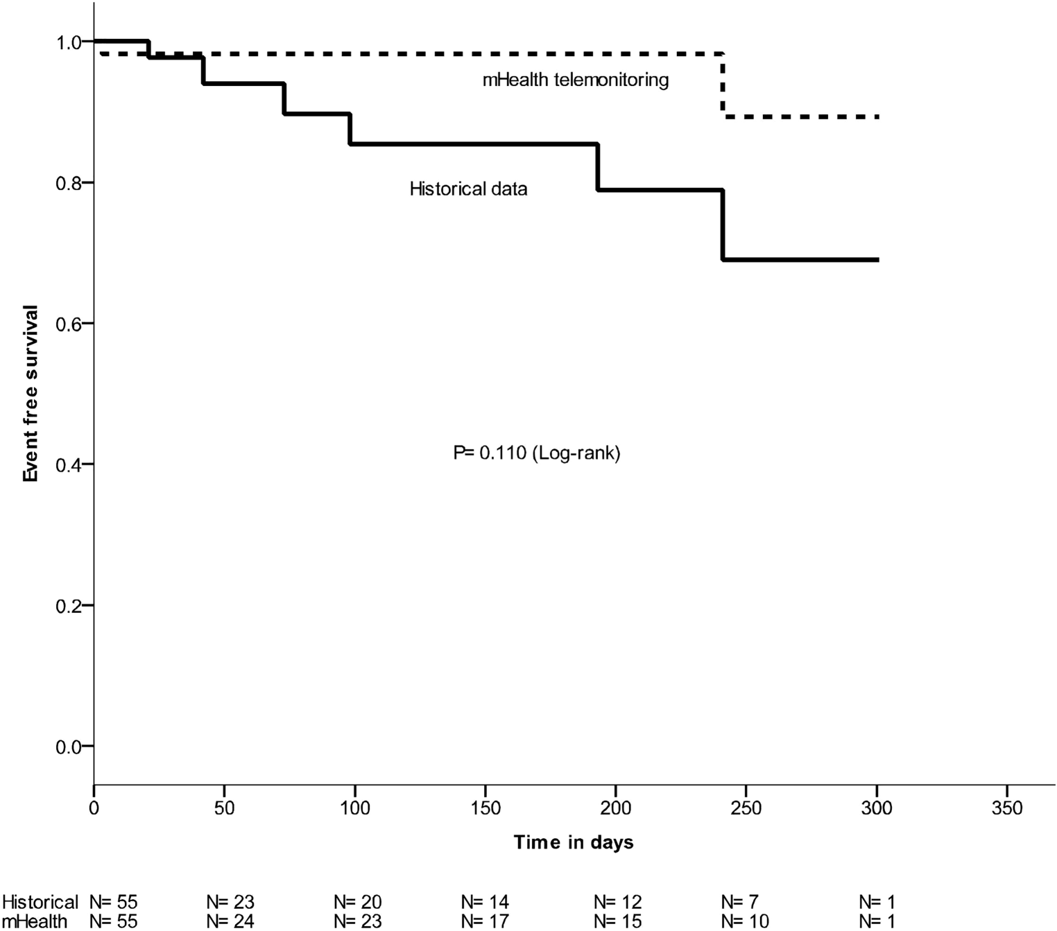 Event-free survival of patients with adult congenital heart disease (dotted line events during m‑Health telemonitoring, straight line events in historical data)