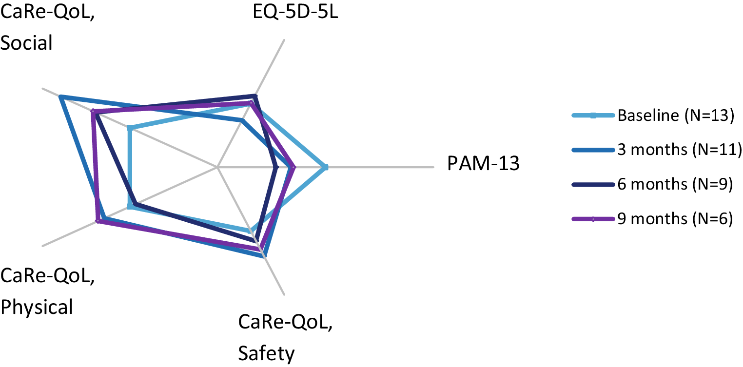Patient-reported outcome measures (light blue baseline, blue 3 months, dark blue 6 months). Baseline is set as median. (Self-management PAM-13, quality of life, general EQ-5D-5L, Safety CaReQoL safety, Physical CaReQoL physical restrictions, Social and emotional CaReQoL social and emotional)