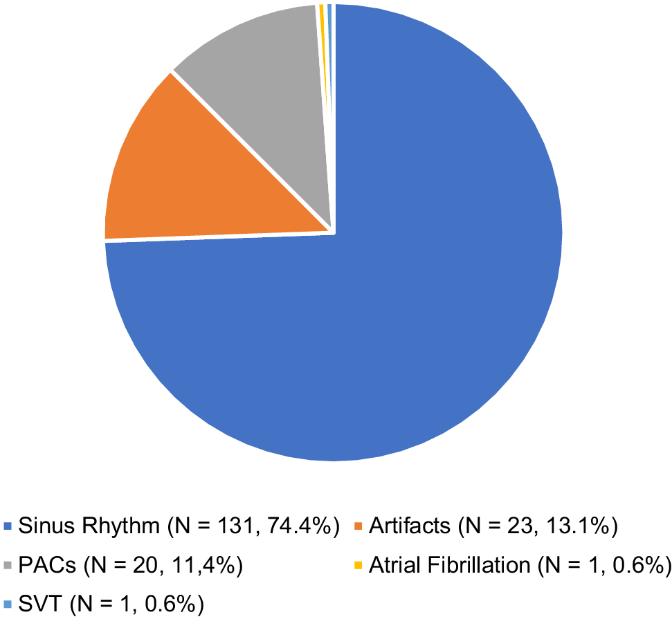 Single-lead ECG measurements were performed frequently, and turned out to predominately be sinus rhythm. In Fig. 4 the rhythms of 176 ECGs during symptoms are shown. The majority (74.4%) of the patients could be reassured since sinus rhythm was found while the patient experienced palpitations. In one patient with palpitations, previously undiagnosed atrial fibrillation was found and another ECG also showed asymptomatic sinus node dysfunction. Larger scaled studies are warranted to distinguish which subgroup has most benefits from which type of telemonitoring.