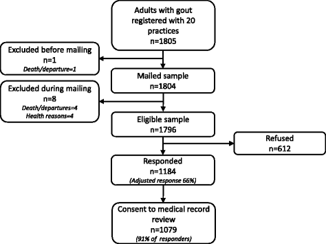The baseline survey population consisted of 1805 people (Fig. 1), of whom nine were excluded during the mailing process (died, left the general practice or other serious health reasons). Of the remaining 1796 people, 1184 (66 %) responded to the baseline survey. Of these, 1079 (91 %) consented to their medical records being reviewed.