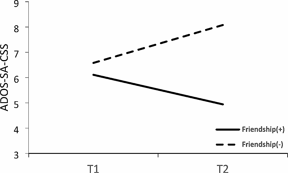 A distinct developmental change was observed for the change in social communication deficits during follow-up, with the group with lower friendship skills displaying more severe symptoms than the group with a greater ability to form friendships. Furthermore, both friendship ability groups demonstrated improvements in adaptive socialization and daily living skills over time, with adolescents with a greater friendship ability experiencing greater gains.