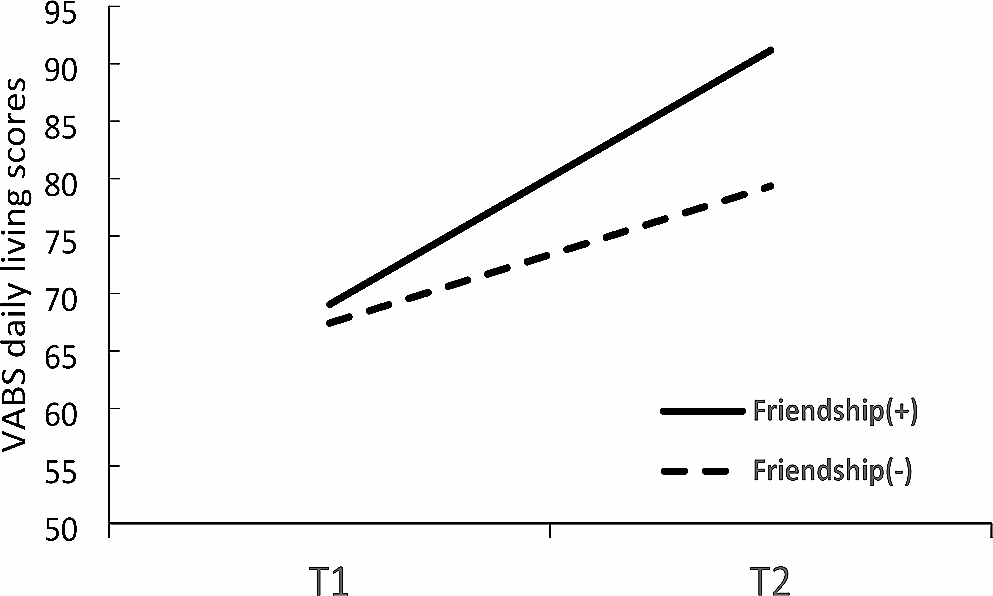 The change in the VABS communication subdomain score between T1 and T2 was examined for each group separately using the Wilcoxon signed rank test. The analysis indicated that scores at T2 (Friendship(+): median = 84, M = 87.39, SD = 13.03; Friendship(-): median = 89, M = 83.70, SD = 11.55) were significantly greater than scores at T1 (Friendship(+): median = 70, M = 71.94, SD = 6.16; Friendship(-): median = 74.5, M = 70.64, SD = 10.20) for both examined groups (Friendship(+): Z = −3.03, p = .002; Friendship(-): Z = −3.14, p = .002).