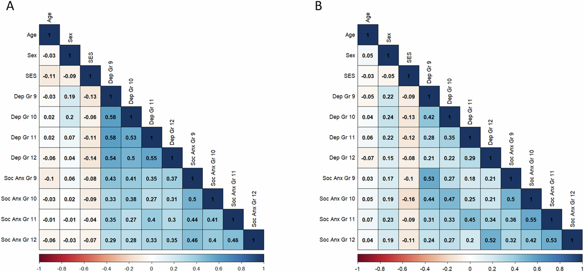 Descriptive statistics (means and standard deviations) are shown in Table 1. Of note, the average levels of depressive symptoms and social anxiety across all high school years in both samples were around a two on each respective scale, indicating that adolescents experienced symptoms of mental health problems “sometimes”. Correlations among study variables are shown in Fig. 1.