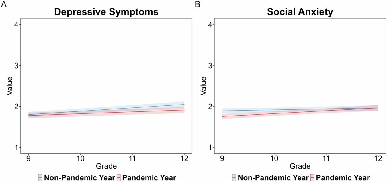 Two mixed effects regression analyses to test for pandemic effects were conducted for depressive symptoms and social anxiety. For depressive symptoms, there was no significant main effect of the pandemic (B = −0.024, SE = 0.027, p = 0.380) or significant interaction between the pandemic and grade (B = −0.037, SE = 0.018, p = 0.036; note that this effect is trending after correcting for multiple comparisons). For social anxiety, there was a significant main effect of the pandemic (B = −0.134, SE = 0.028, p < 0.001) and interaction between the pandemic and grade (B = 0.045, SE = 0.019, p = 0.019). The interaction indicated that social anxiety was higher in grade 9 during non-pandemic years compared to pandemic years, but this difference became smaller over the high school years. See Fig. 2 for the effects plots depicting the interactions. Given that these pandemic-related differences were minimal and indicated that mental health was not worse during the pandemic, all years of the study were included to assess differences in the mental health indicators from grade 9 to grade 12 (to be consistent with the Past-Sample).