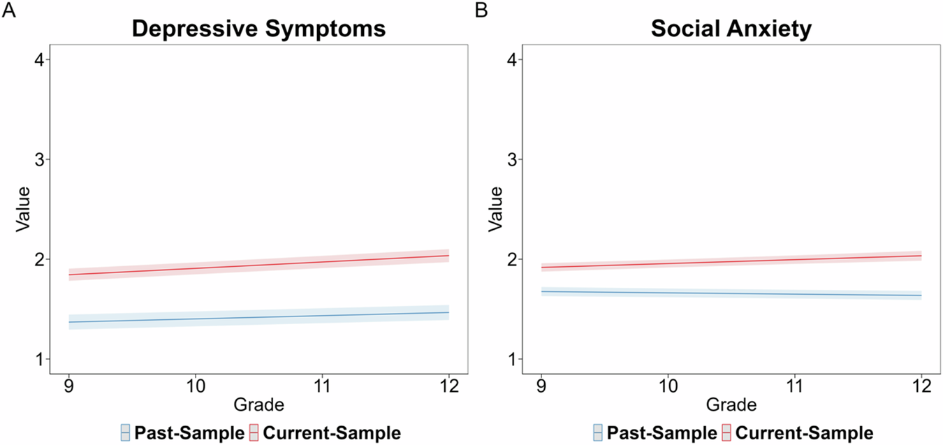 An important contribution of the current study was to assess differences in the proportion of students at risk for consistently high mental health problems in each sample. Most adolescents in both samples were never at an elevated risk for mental health problems, but there was a higher proportion of adolescents at risk for consistently elevated mental health problems across high school in the Current-Sample (10.96% and 15.52% were classified as moderate or high risk for depressive symptoms and social anxiety, respectively) compared to the Past-Sample (1.98% and 4.63% were classified as moderate or high risk for depressive symptoms and social anxiety, respectively). These adolescents are of particular concern. Interventions and resources aimed at improving adolescent mental health would benefit from directly targeting these adolescents who are consistently at risk over time. These findings also highlight the importance of using a longitudinal approach to understand generational differences among adolescents. Some adolescents may report elevated mental health problems at one time point, but then report lower mental health problems at later time points, indicating that their mental health problems may be situational and not indicative of a chronic problem.
