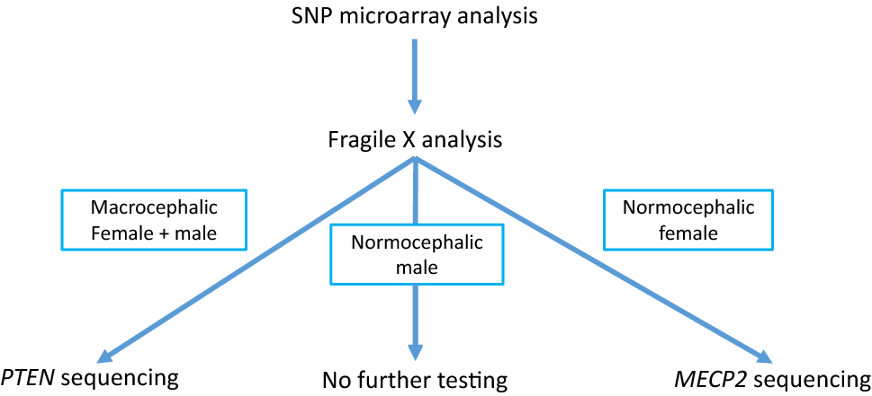 The improved NDR (Fig. 1), which we are evaluating in this study, puts CMA as the first line test for all, with Fragile X as the 2nd line for all (if CMA is not positive). If Fragile X analysis was negative for a full mutation (normal, grey zone or premutation repeats), patients noted to be macrocephalic would receive PTEN sequencing and normocephalic female patients would receive MECP2 sequencing.