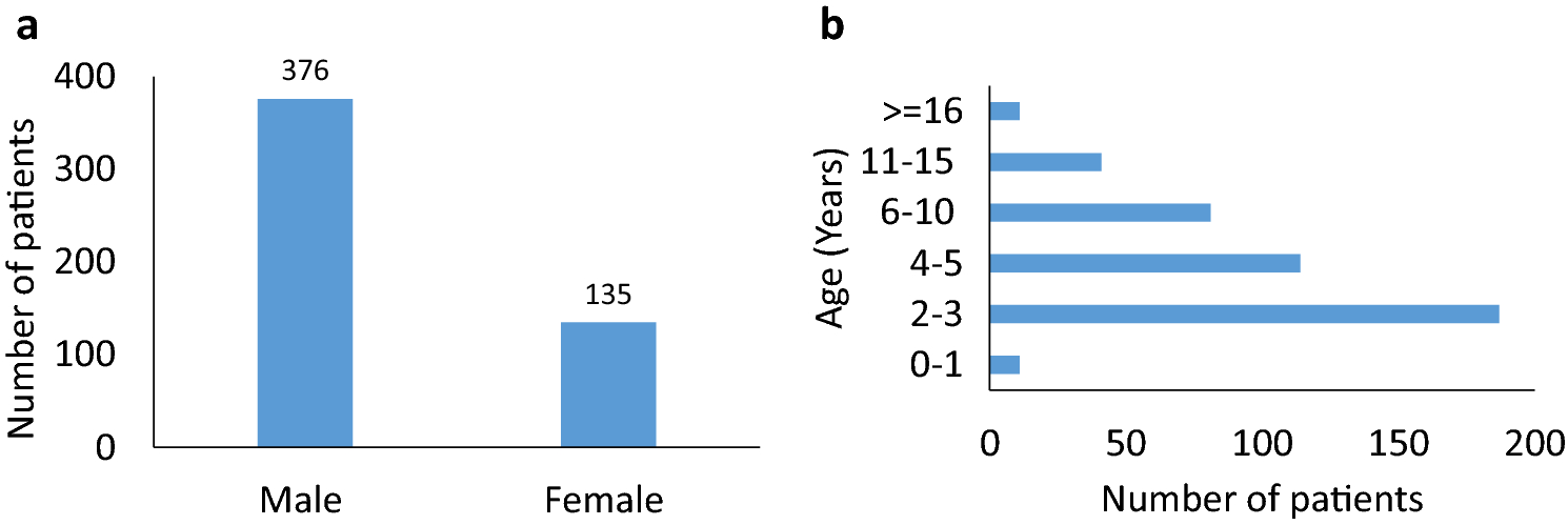 Description of the 511 patient’s cohort from January 2018 to April 2019. a A total of 511 patients tested at our institution from January 2018 to April 2019 included 376 males and 135 females. b Age ranged from a few months to 35 years old. The majority of the patients were under 5 years old