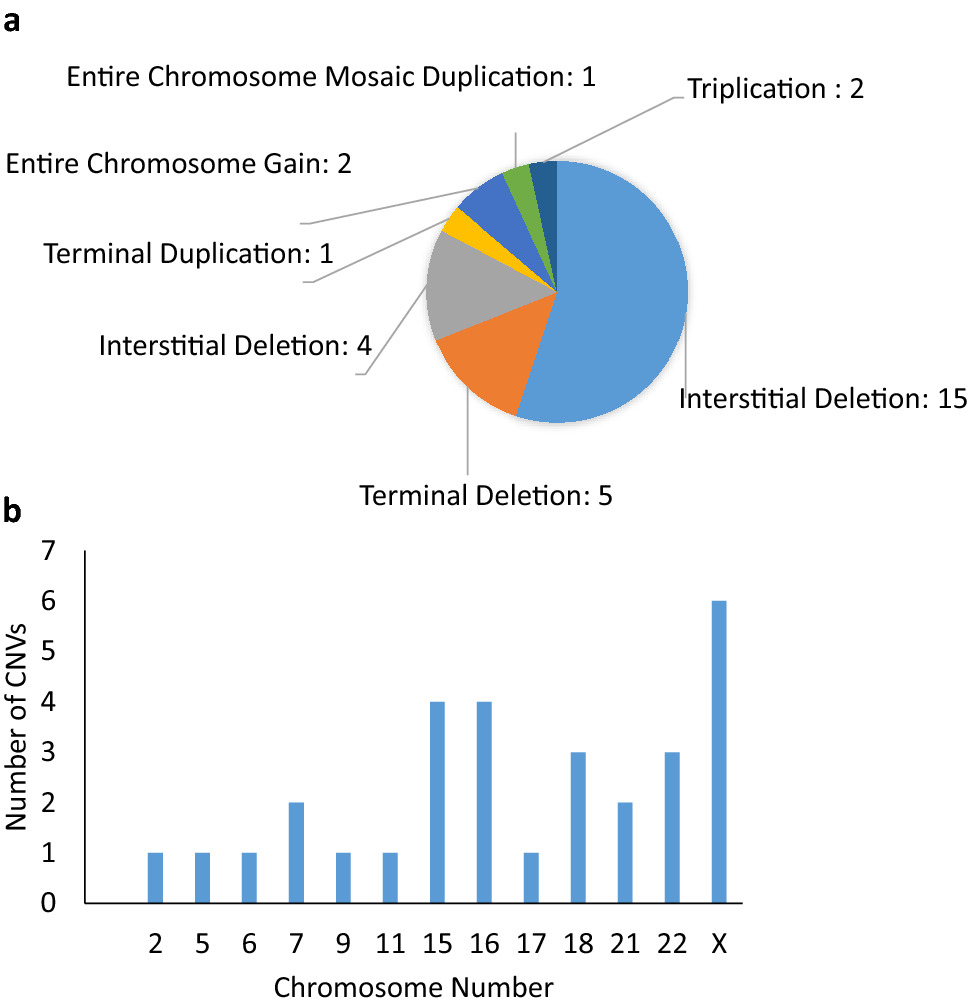 Clinically significant CNVs identified by SNP microarray analysis in 511 patients. a Classifications and frequency of 30 reportable CNVs in 27 patients through SNP microarray analysis. The majority of CNVs are interstitial deletions (15/30), followed by terminal deletions (5/30), interstitial duplications (4/30), entire chromosome gain and mosaic duplications (3/30). b Accumulated numbers of CNVs on different chromosomes. The most often affected chromosomes are X, 15 or 16