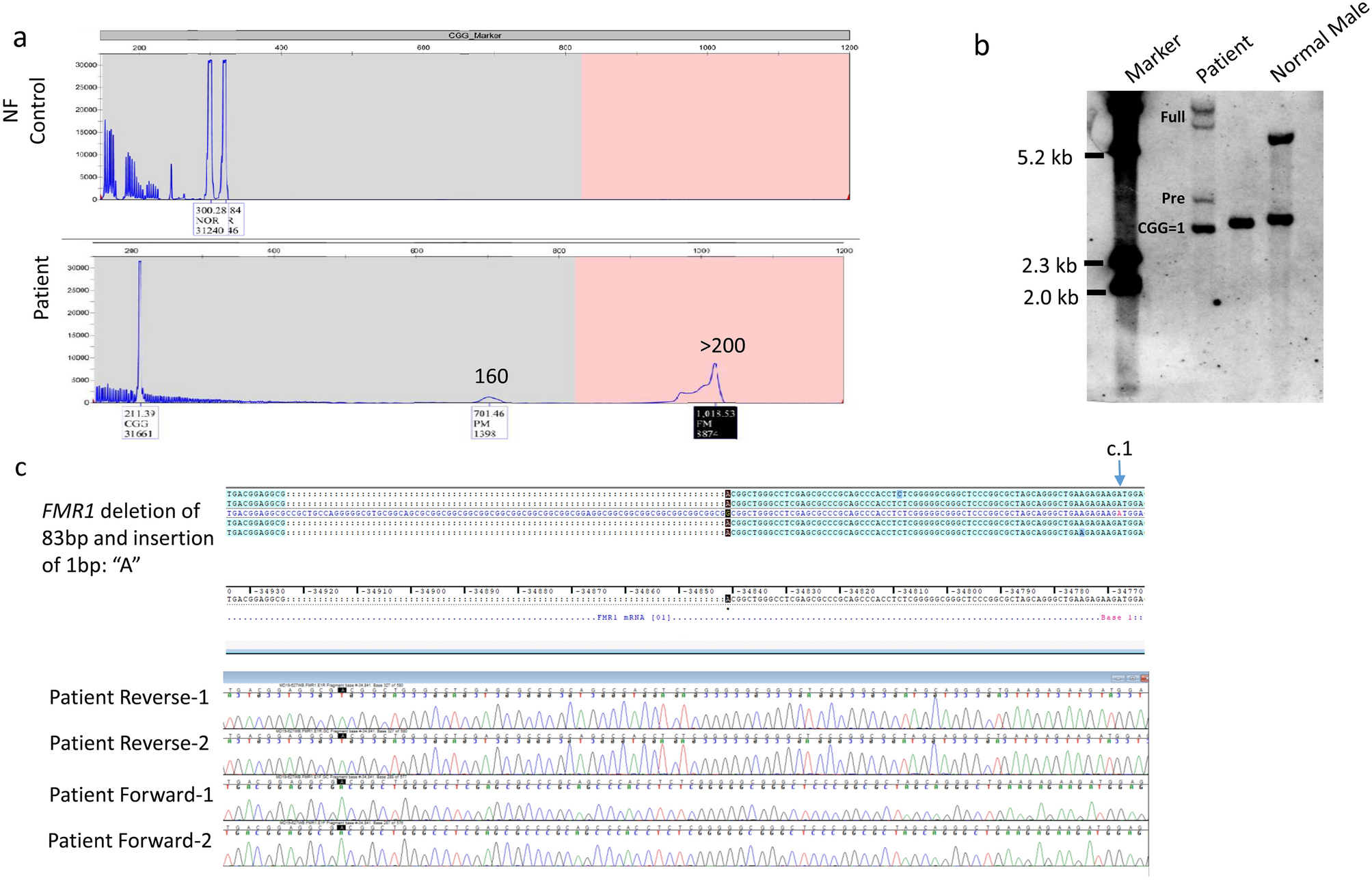 Isolated genomic DNA was assayed for CGG-repeat expansion of the FMR1 locus by analysis of DNA fragments generated by the AmplideX FMR1 polymerase chain reaction (PCR) and separated by capillary electrophoresis ABI 3500XL Genetic Analyzer (Applied Biosystems, Foster city, CA). Normal and mutation categories of FMR1 alleles were determined according to the ACMG guidelines with the normal repeat size as 5–44, gray zone as 45–54, premutation as 55–200, and full mutation > 200. Full mutations were confirmed by Southern blot.