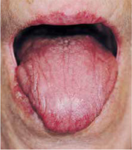 Afb. 1 Extreem droge tong bij een patiënte met het syndroom van Sjögren.