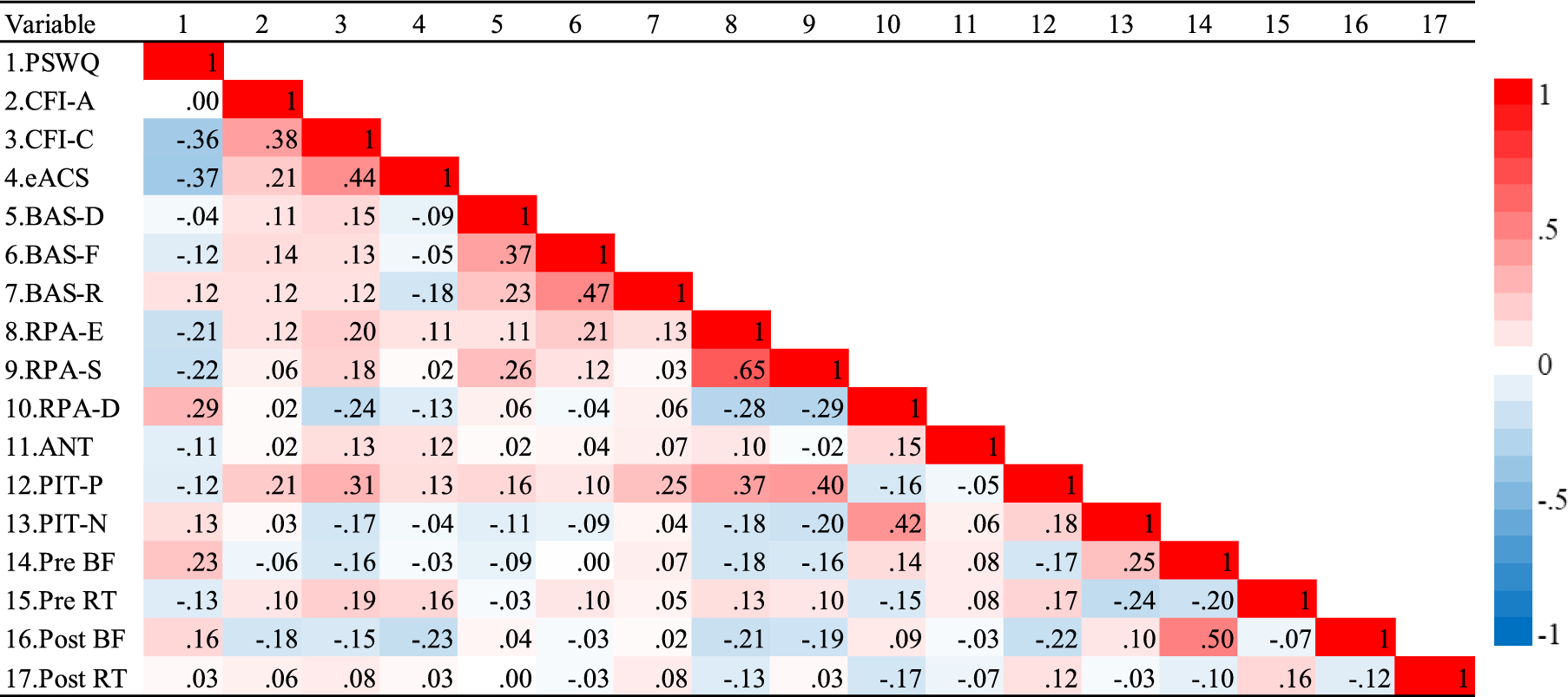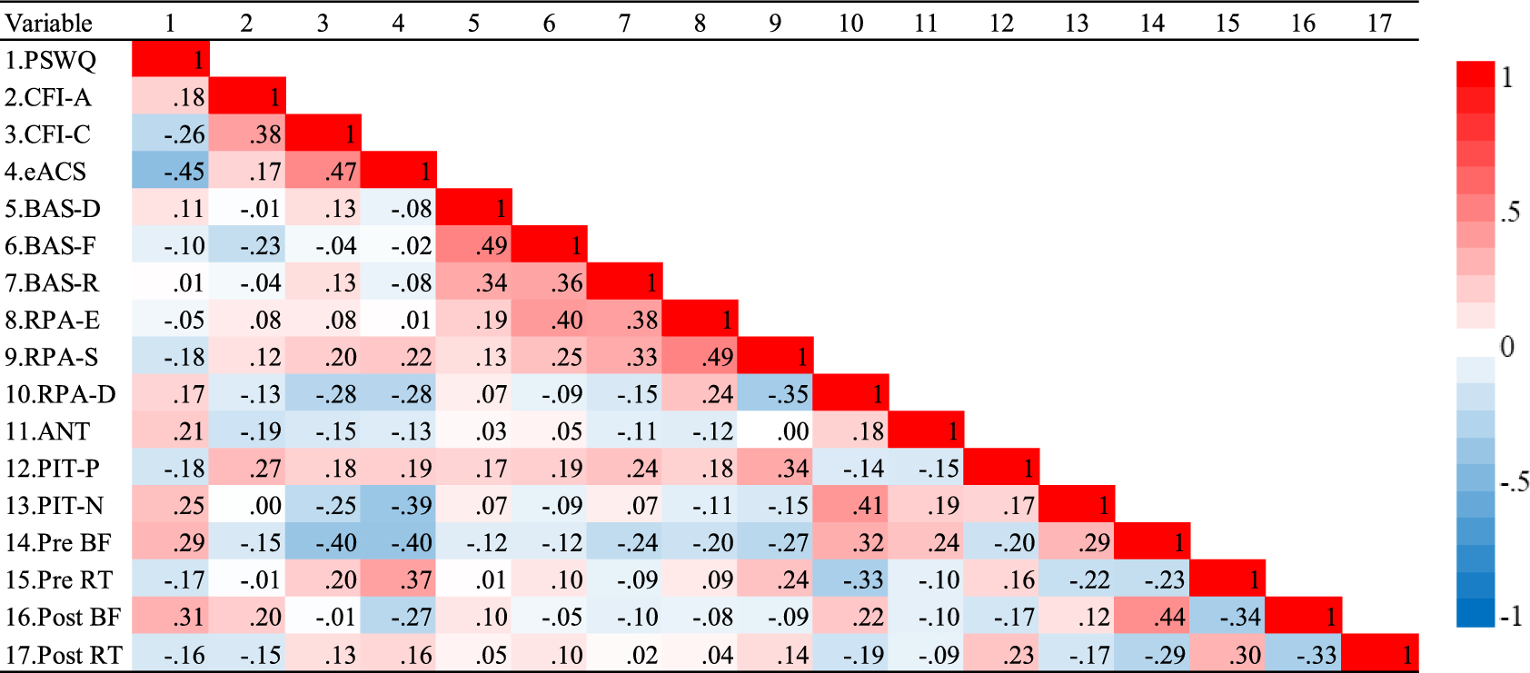 Means and standard deviations are provided in Table 1. To visualize the relationship between different variables, bivariate correlations are presented using a heatmap in Fig. 1.